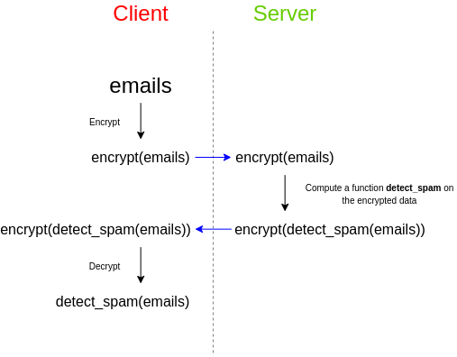 As a simple example, imagine that you have a set of emails, and you want to use a third party spam filter to check whether or not they are spam. The spam filter has a desire for privacy of their algorithm: either the spam filter provider wants to keep their source code closed, or the spam filter depends on a very large database that they do not want to reveal publicly as that would make attacking easier, or both. However, you care about the privacy of your data, and don't want to upload your unencrypted emails to a third party. So here's how you do it: