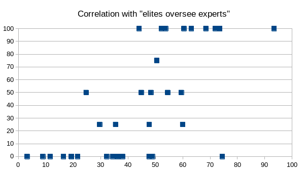 Correlations with "masses recognize elites" and "elites oversee experts" were high; higher for the second than the first, though perhaps Hanson and I had different meanings in mind for "recognize". The "intentional structure" chart has an empty bottom-right corner but a full top-left corner, suggesting that intentional structure is necessary but not sufficient for something to be an institution.